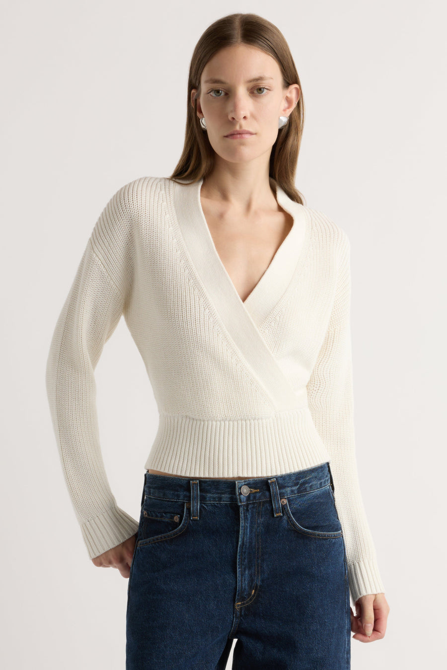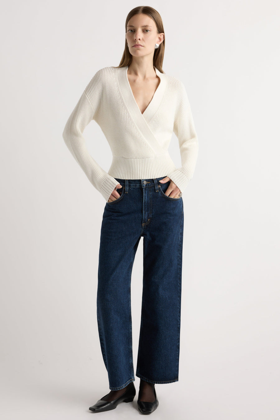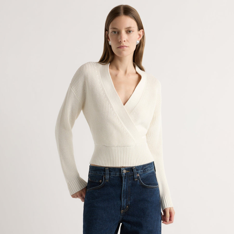 Very nice quality. Form flattering fit. Looks just like the picture. This sweater will look great with wide leg jeans!