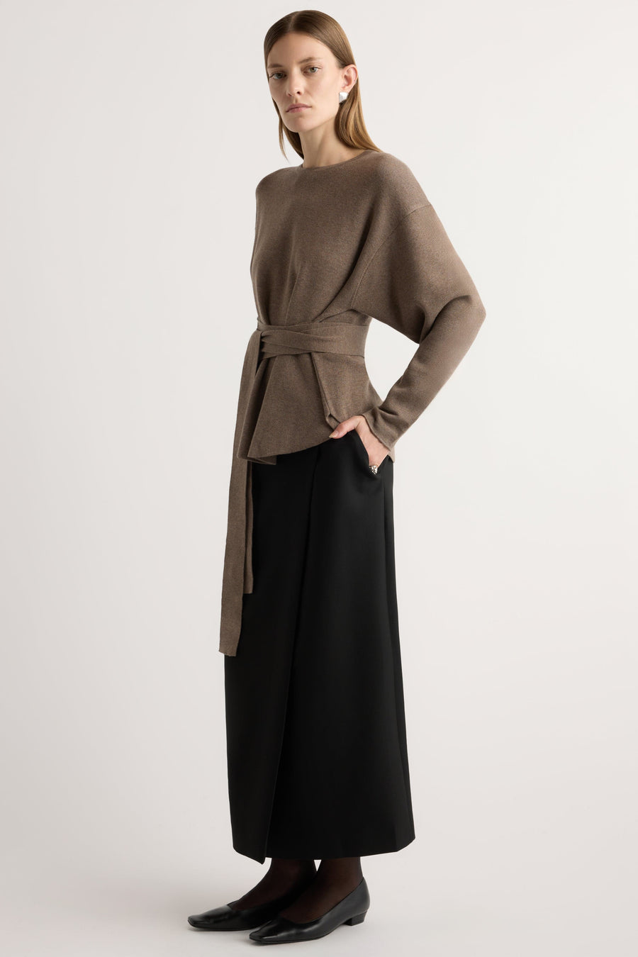 This is an iconic, flattering sweater that I own in every color. It flatters in the right places and. Can be dressed up or down. The fabric is organic cotton. I am typically an L at MC. I sized up to an XL to get the extra length. It gives me the same look that you see on the model
