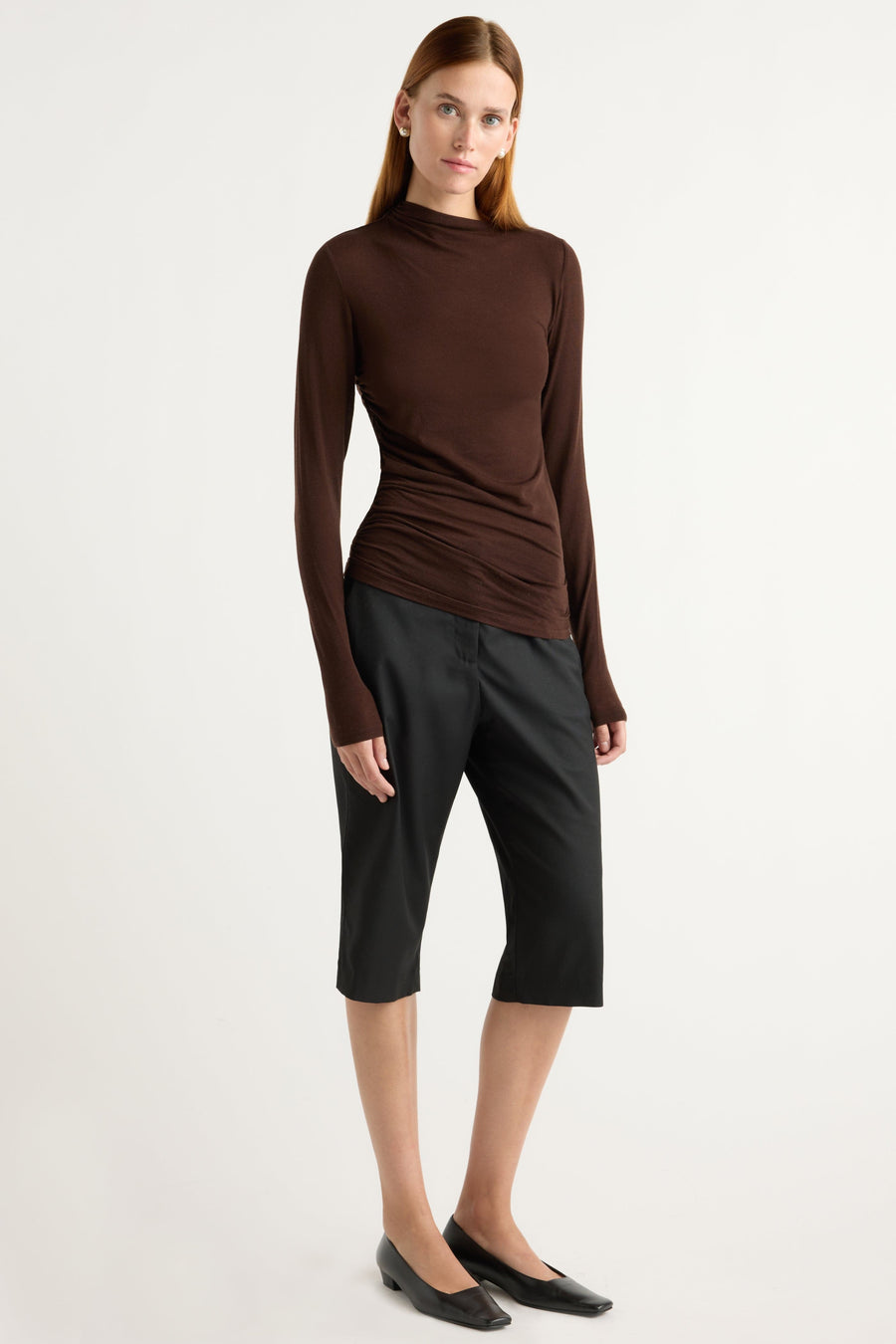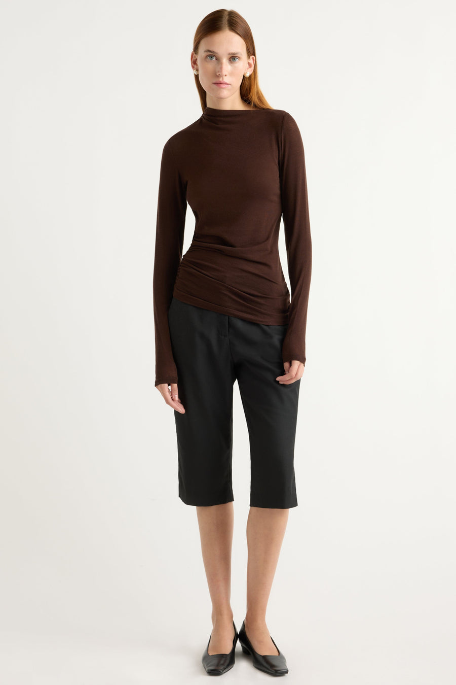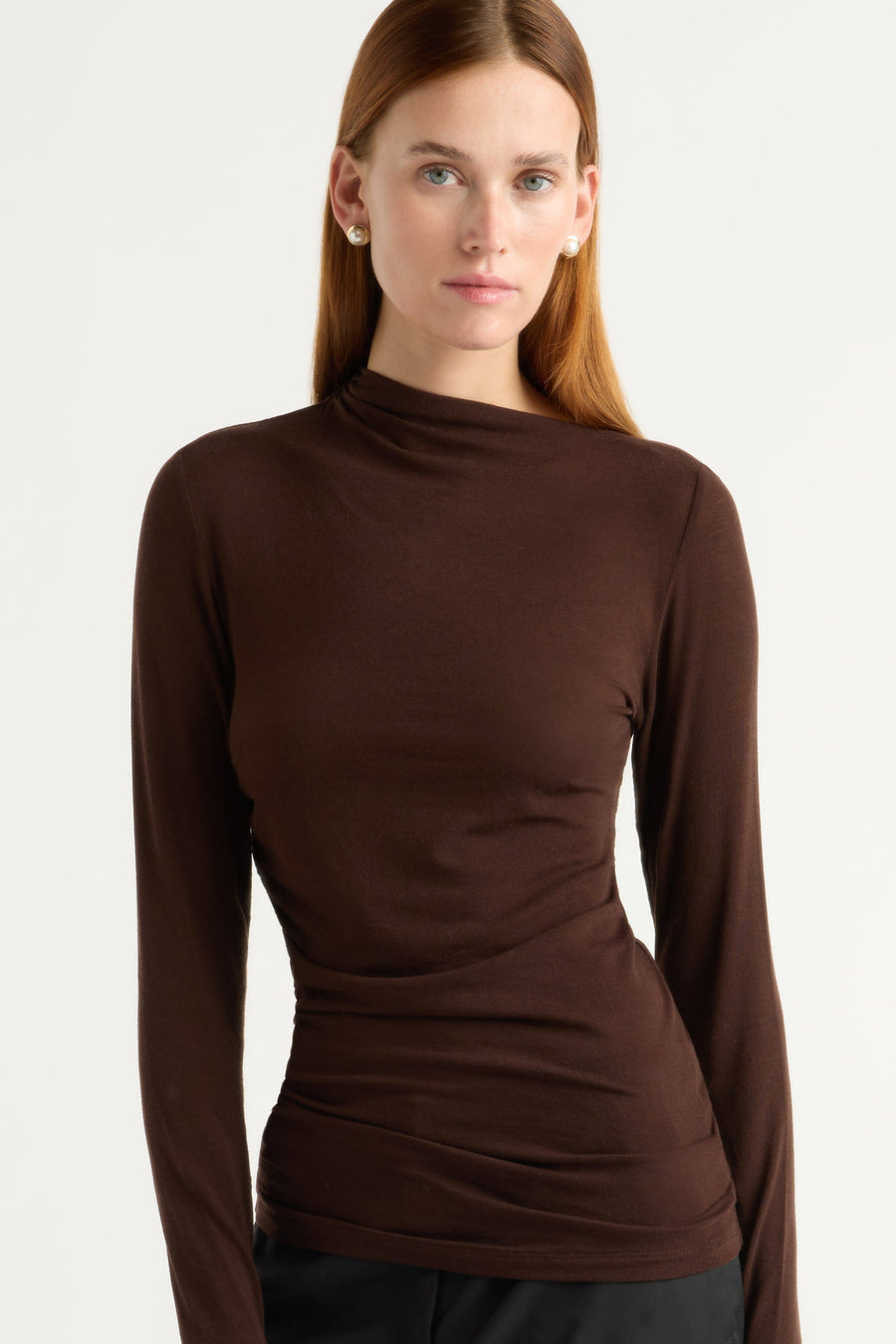 Color is nice. I expected it to be a little more wine, maybe just the way it looked on my screen. It's chocolate brown. I love the weight of the fabric. The semi-sheerness is tricky. If you have a larger bust, you can see everything. Not okay for work without a camisole. Must be a very thin camisole because the fabric is thin and light.